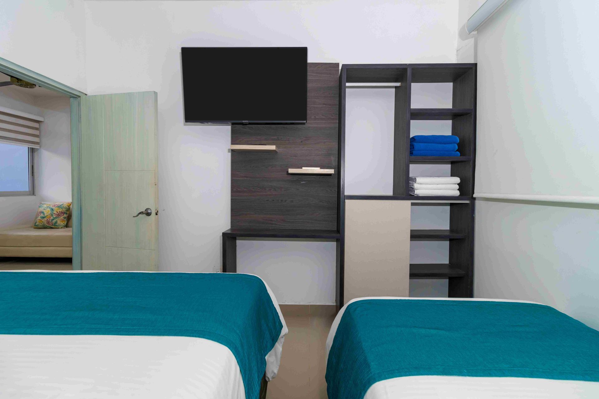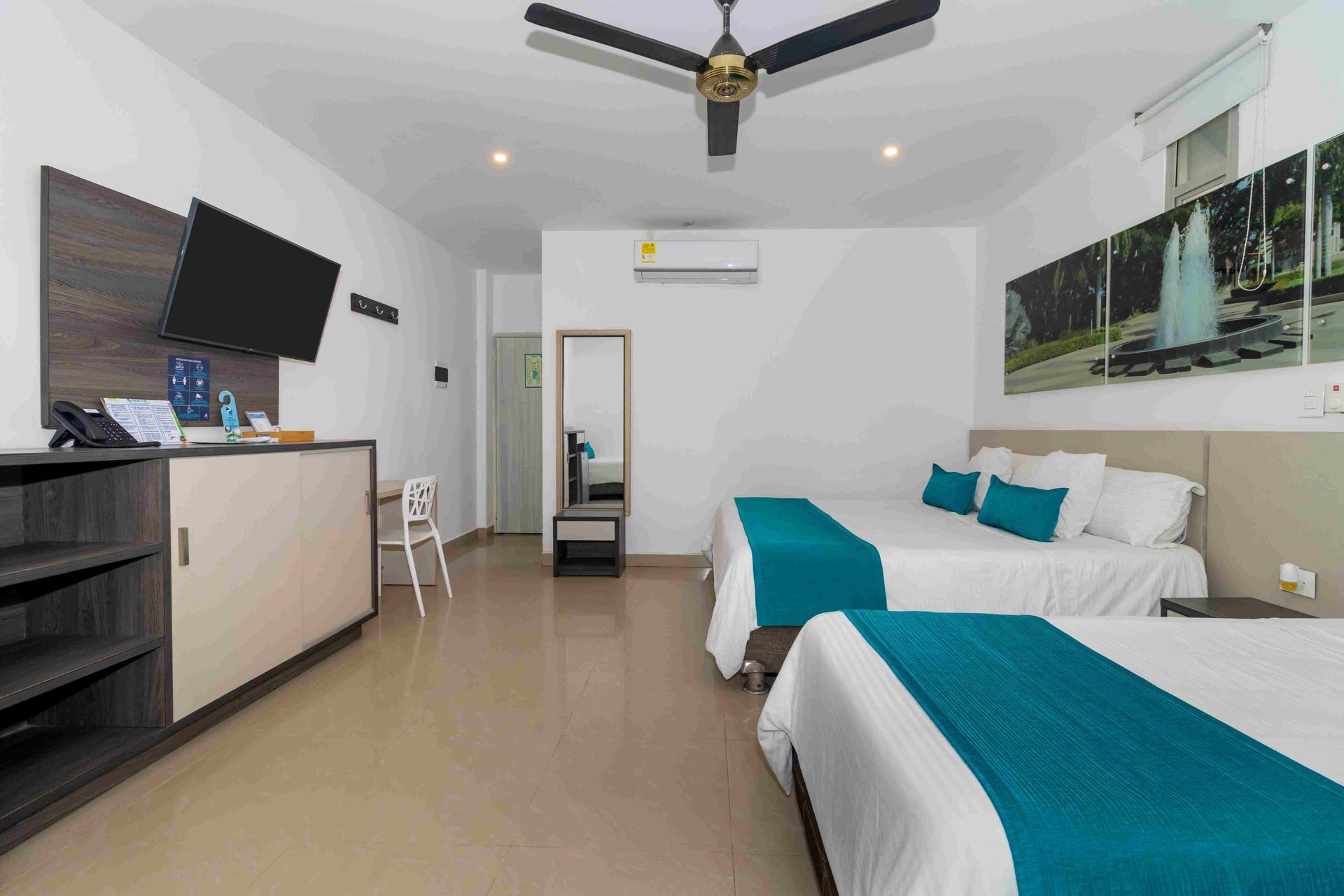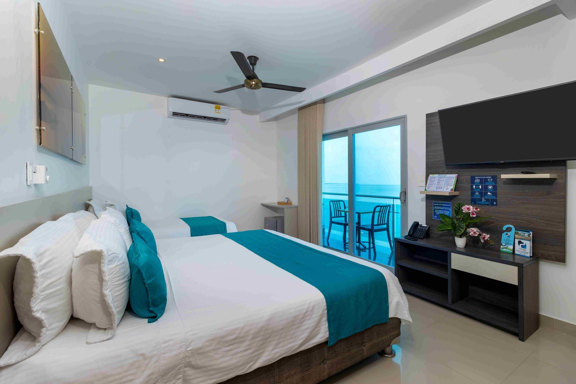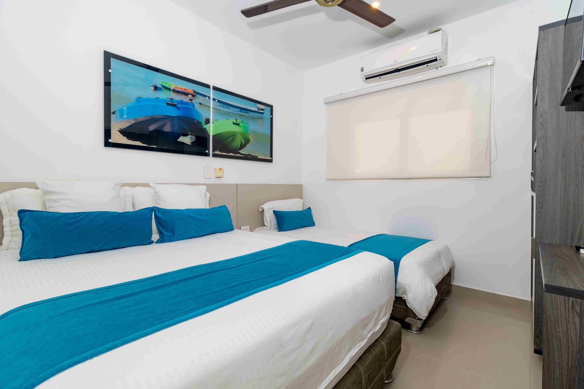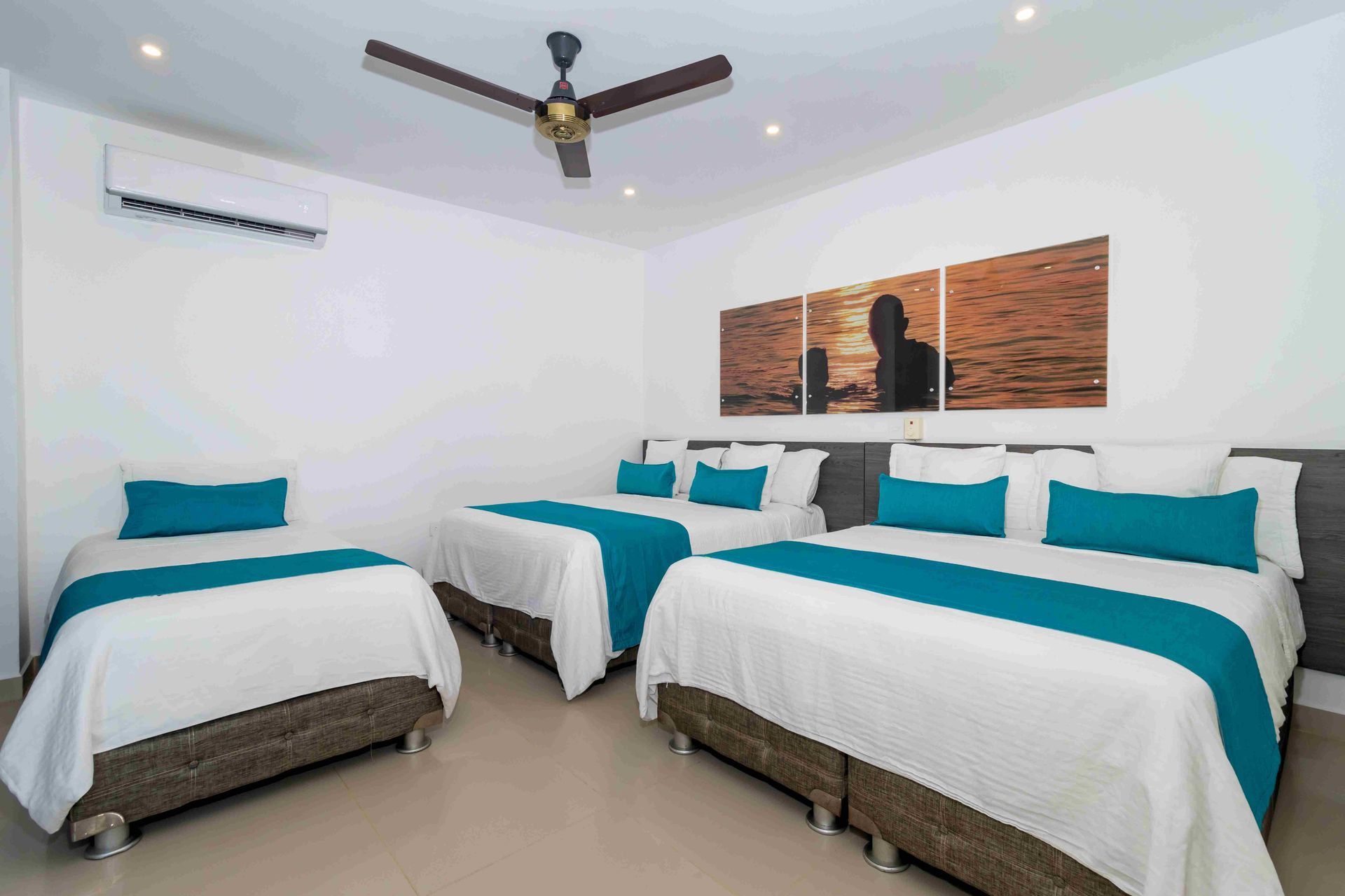 Nuestra amplia habitación múltiple de 34 m² está diseñada para familias, con dos Camas Queen y dos Camas Twin, ofreciendo un espacio generoso para hasta 6 personas. Perfecta para un hospedaje en Coveñas con todas las comodidades necesarias.
